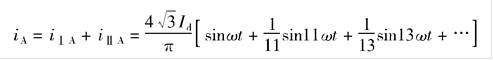 作为一般规律,则以m个相位差π/3m的变压器分别供电的m个三相桥式整流电路可以构成6m相整流电路,其网侧电流仅含6m±1次谐波,而且各次谐波的有效值与其次数成反比,而与基波有效值的比值是谐波次数的倒数。另外,其位移因数均为cosα,而基波因数随相数提高而提高。用与前述类似的方法可求得18相整流电路的基波因数为0.9949,而24相整流电路的基波因数则达0.9971。